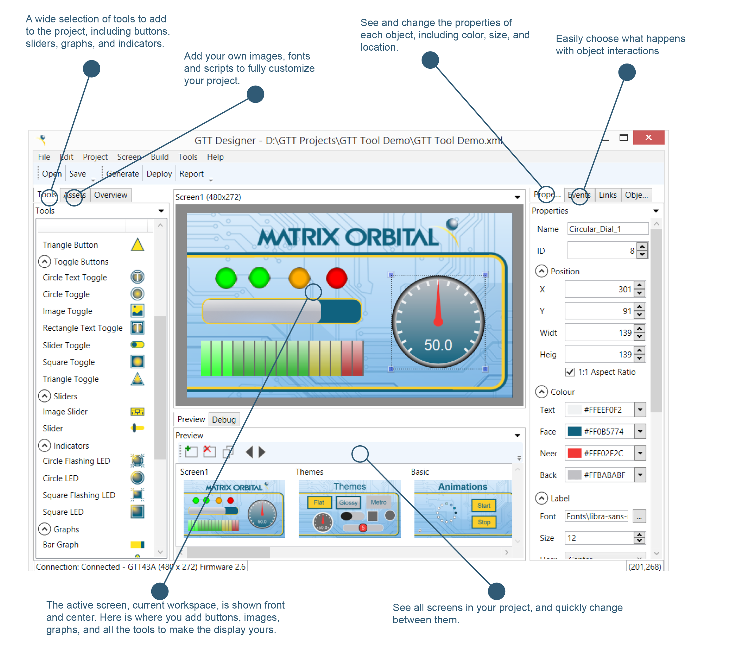 Matrix Orbital’s GTT HMI GUI Software Designer suite is a free software package designed to create impressive GUI and HMI overlays quickly and easily. The software seamlessly integrates with our GTT Series of intelligent displays to provide fast development for TFT's. This, feature rich, software has everything you need to customize the look and feel of your application. Choose from several built-in themes, numerous styles of buttons, sliders, toggles, gauges and other objects, or create your own for the ultimate in tailor-made interfaces.